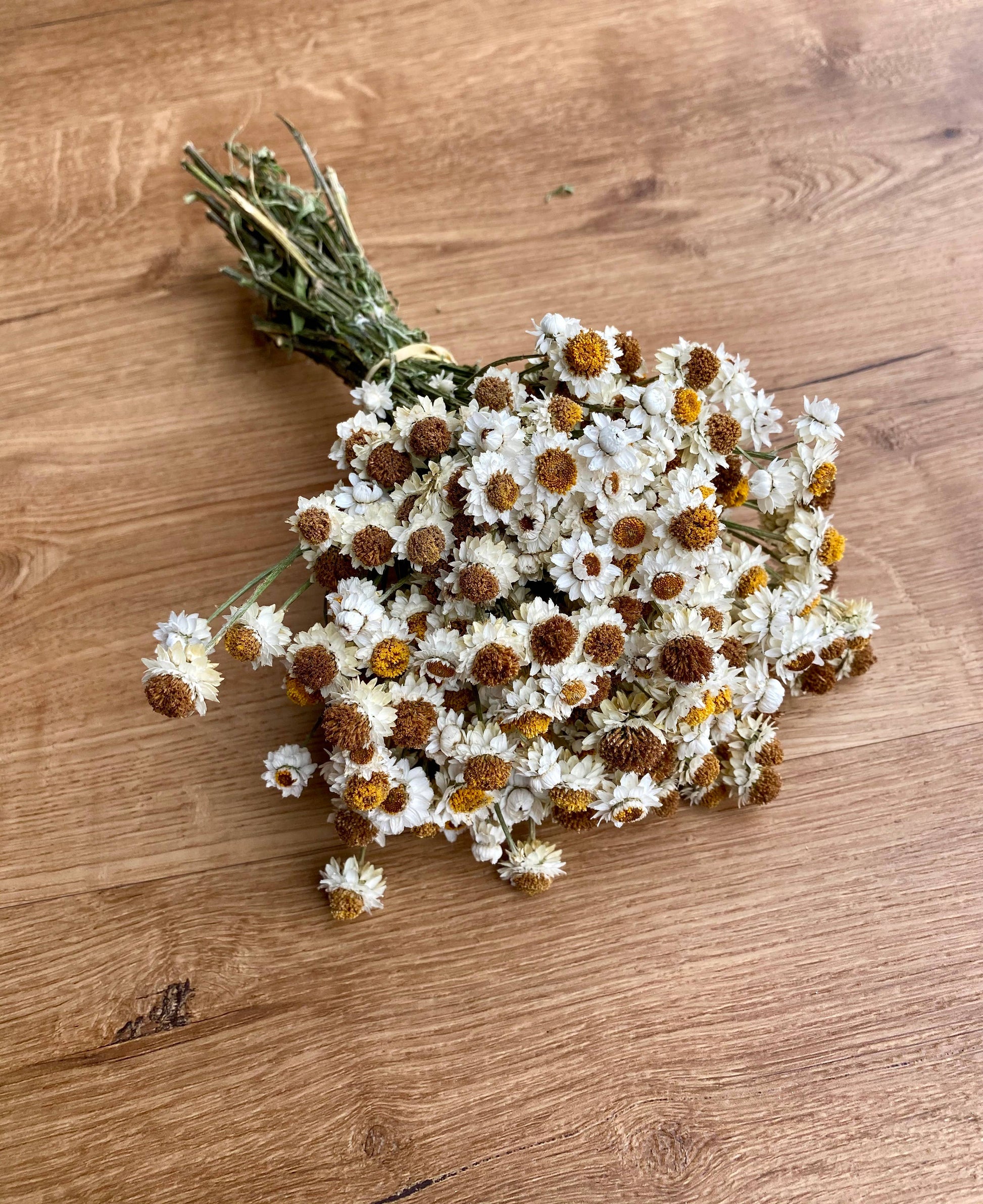Small white flowers with yellow centers, the bloom is approximately .75” diameter and often used to resemble a miniature strawflower. This item is often used in vintage or antique design flair. The Ammobium is dried using ambient air with no added preservatives or coloring. This item will retain the same color, appearance, and integrity dried as when fresh for several years particularly when displayed out of direct sunlight.
