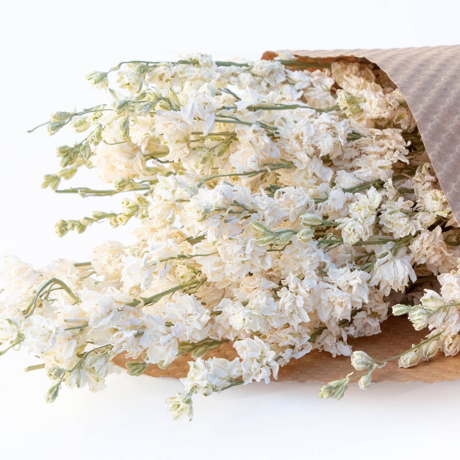 Our dried larkspur bundles are grown with our partner farm in Arizona where they are dried for a long lasting and beautiful bundle of flowers. Each bundle is wrapped in beautiful indented kraft paper ready to be displayed in your boutique for the summer.