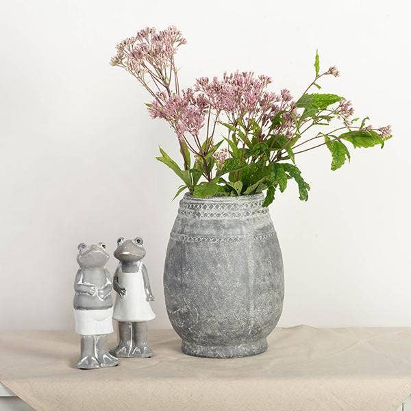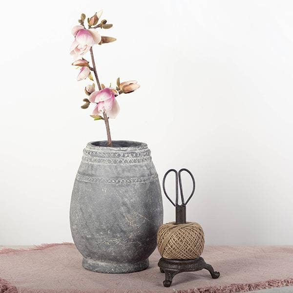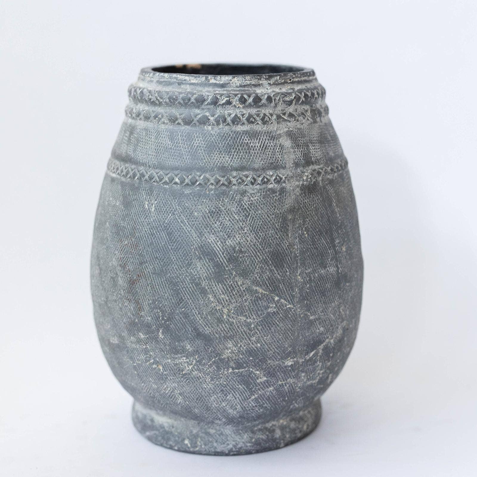 Textured vase. Shabby Chic and Antique/Vintage style.- washed grey and washed white colors- rough surface with a mesh look- x pattern around the top part of the vase