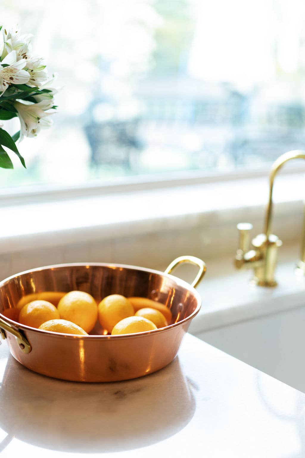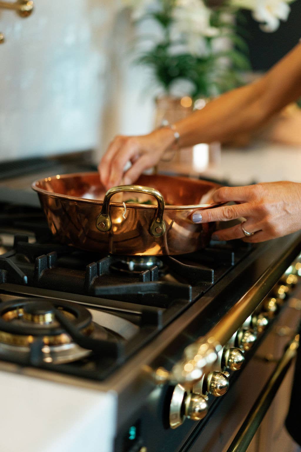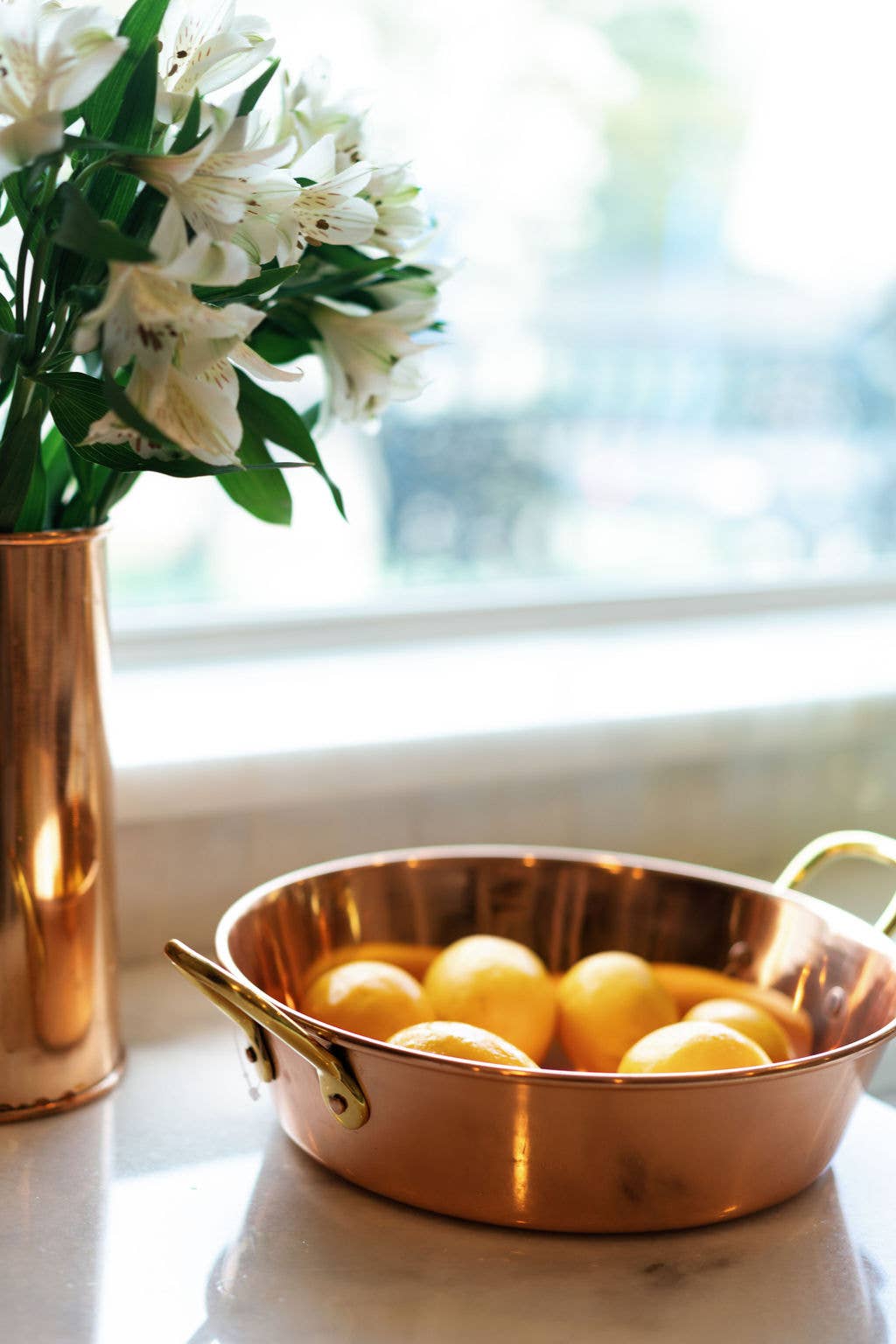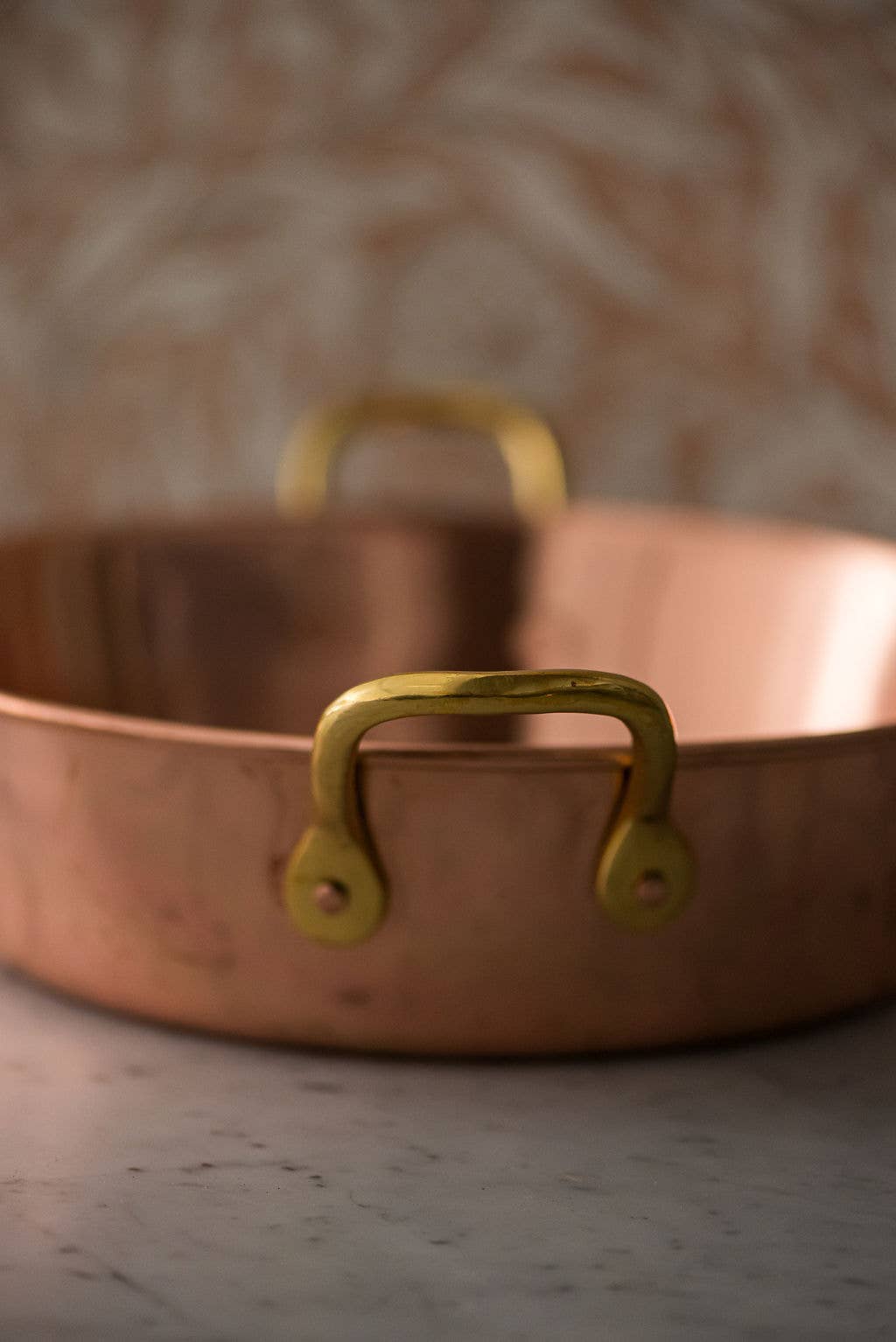 Copper Fait Tout or the "do everything pan". 11" diameter, 3" depth. Made entirely out of copper, featuring two brass handles. If it doesn't belong in a cottage kitchen, it doesn't belong in your kitchen. With that as our model, we designed our Fait Tout Pan. This charming copper pan should be an essential part of your kitchen.