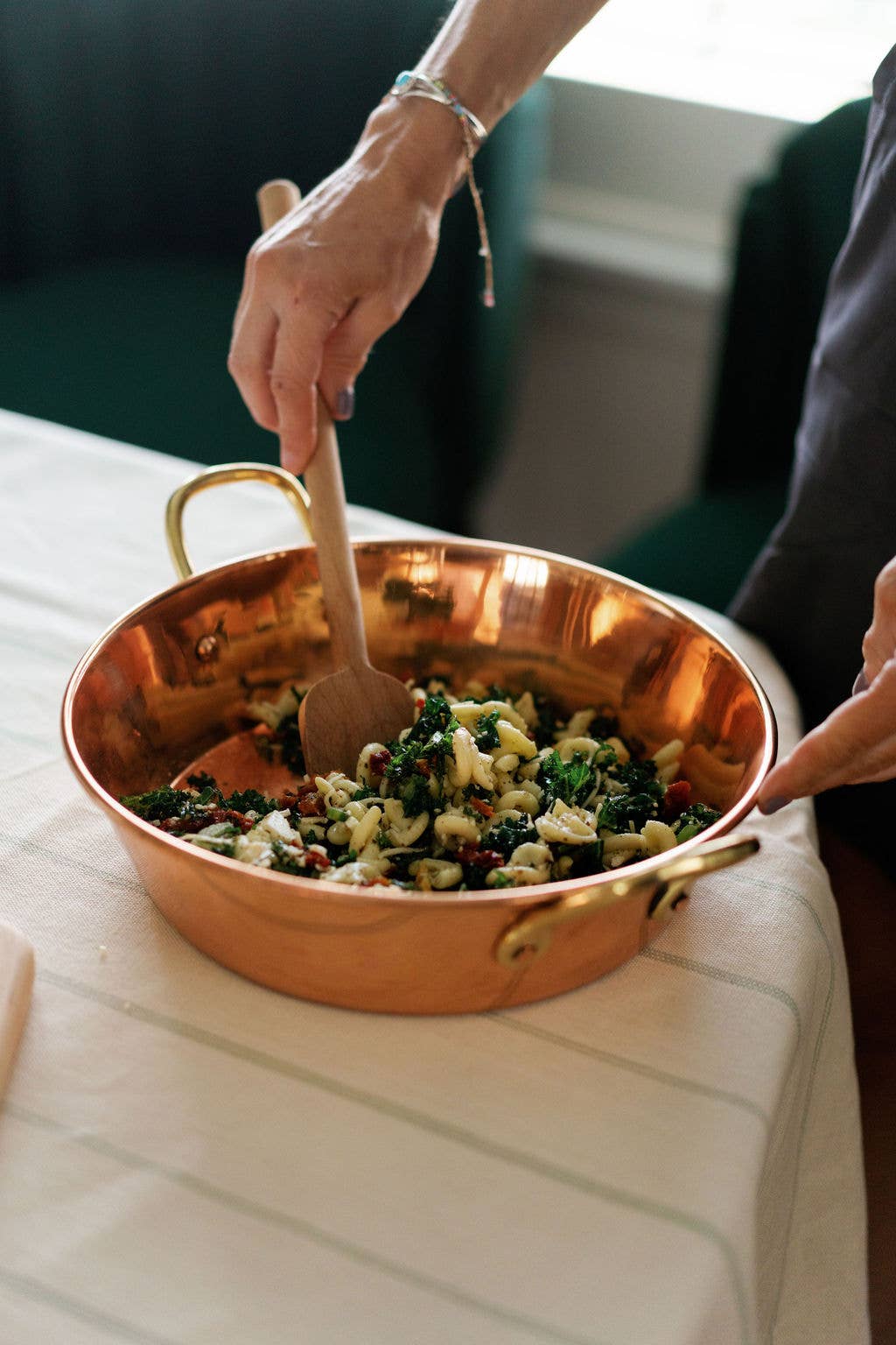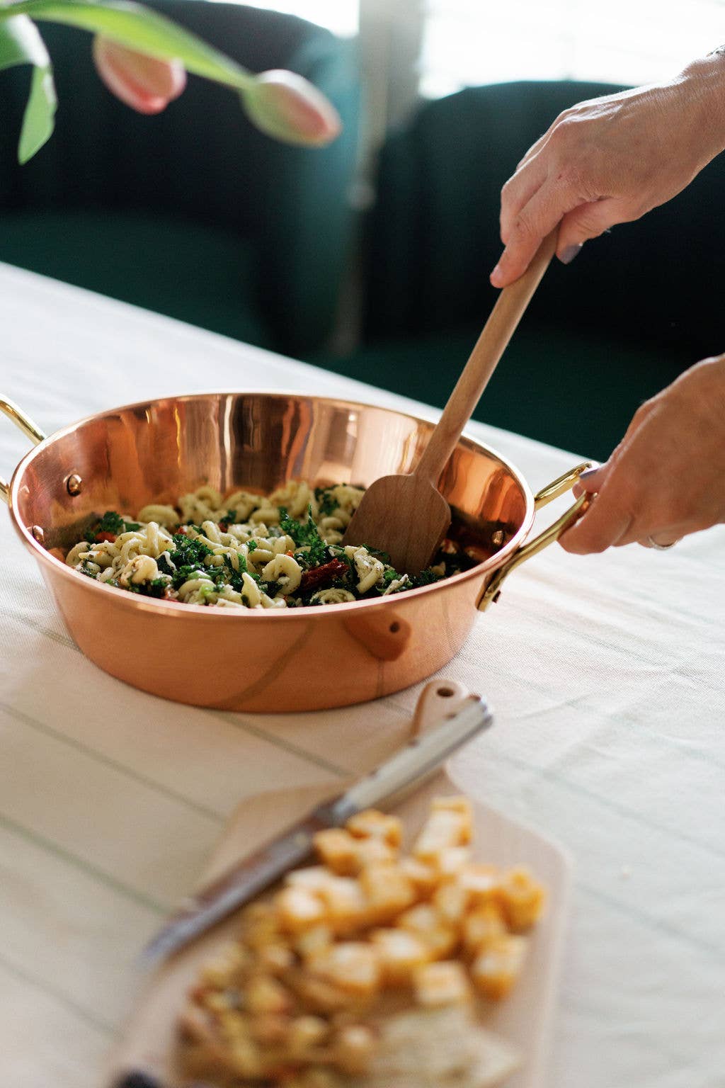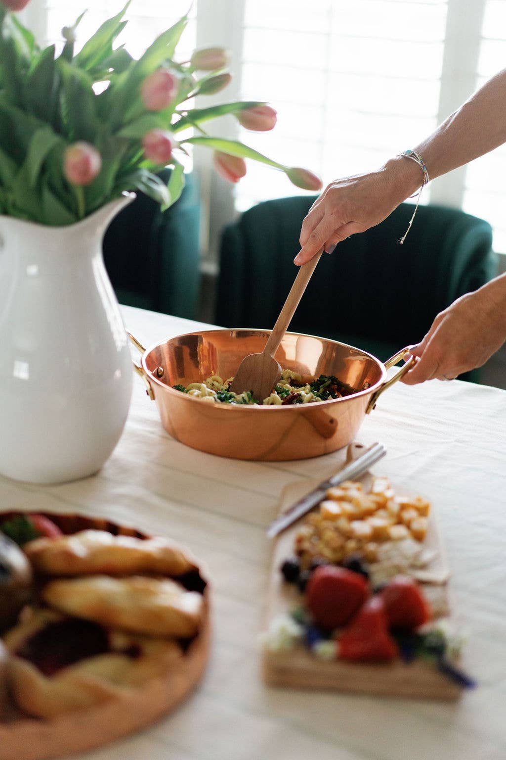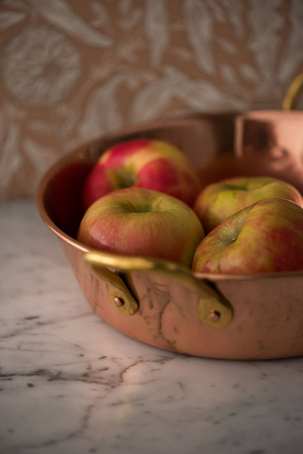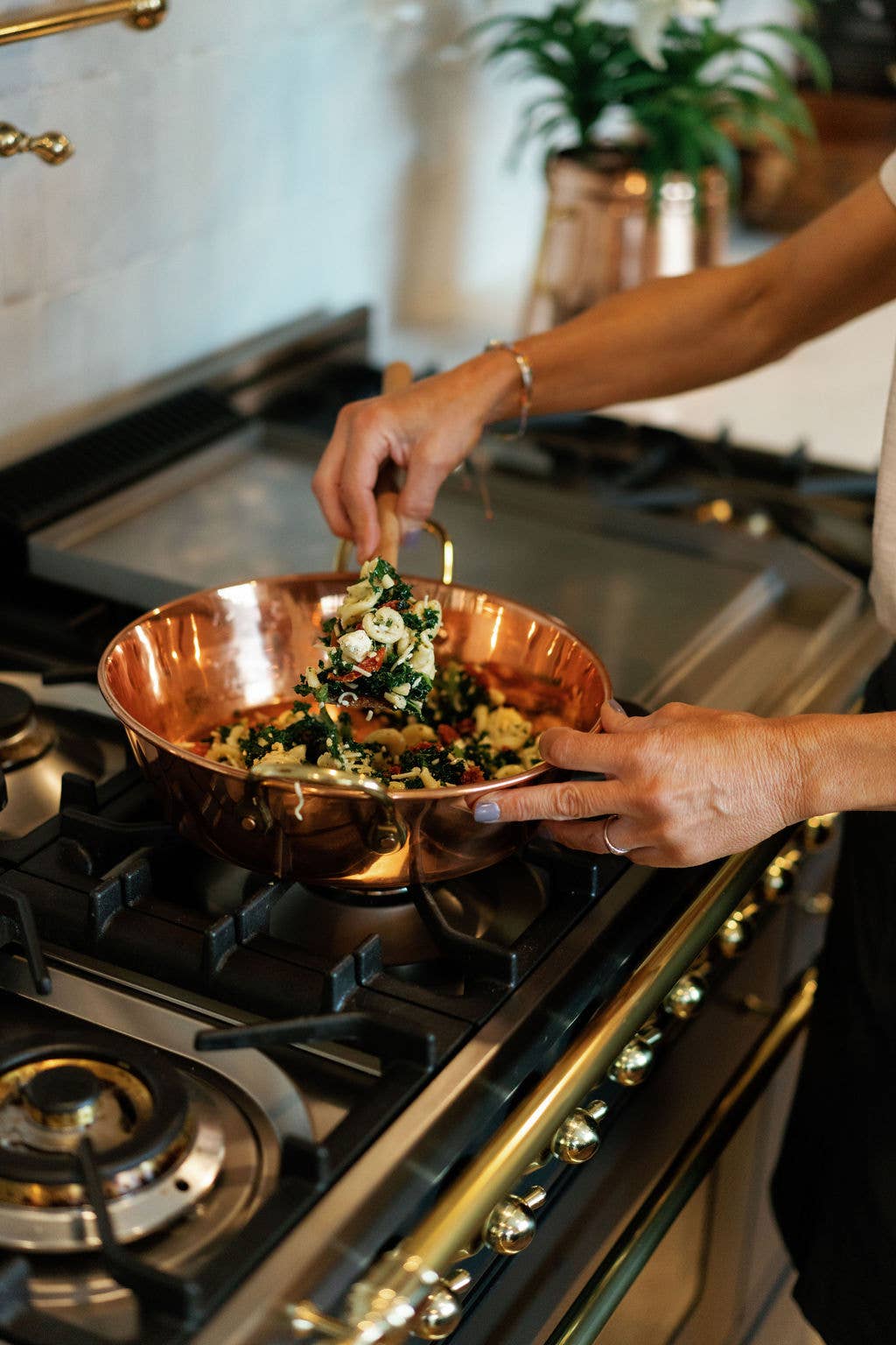 Copper Fait Tout or the "do everything pan". 11" diameter, 3" depth. Made entirely out of copper, featuring two brass handles. If it doesn't belong in a cottage kitchen, it doesn't belong in your kitchen. With that as our model, we designed our Fait Tout Pan. This charming copper pan should be an essential part of your kitchen.