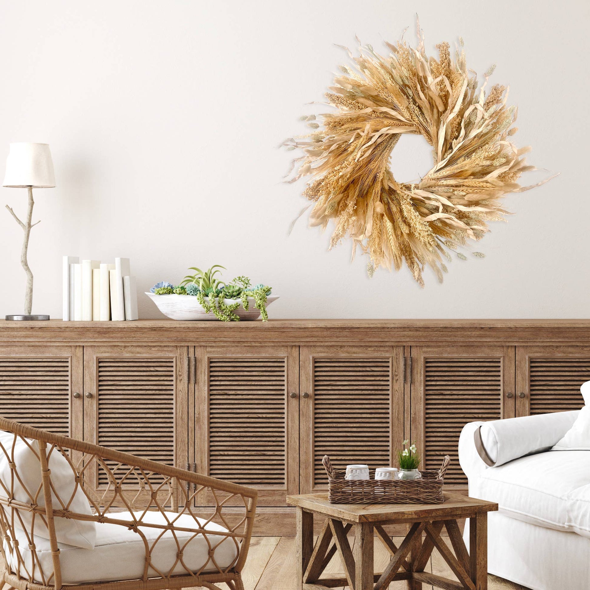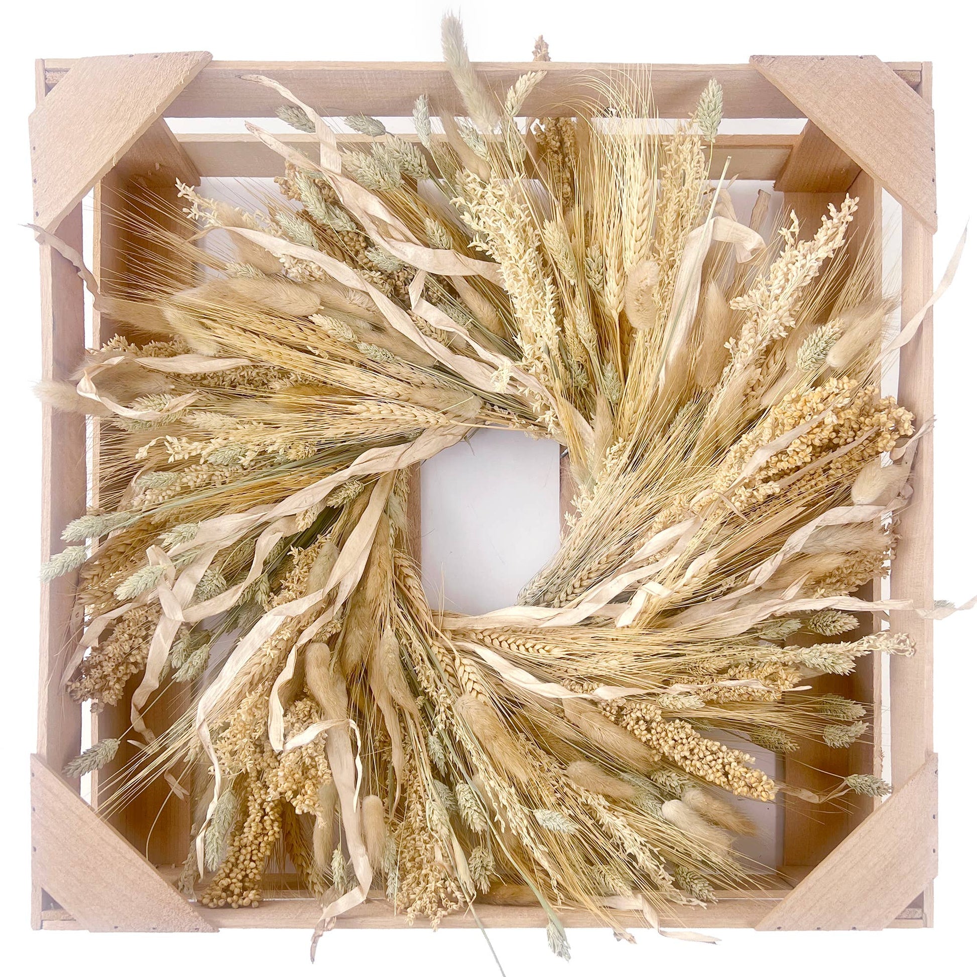 Our wreath design team has outdone themselves with this beautiful Golden Grains Wreath! This opulent natural wreath is sure to bring a wow factor to your door! Designed using a mix of wheat, sorghum, phalaris, bunny tails, and grasses, it is a perfect natural harvest style arrangement. Each wreath is constructed and handcrafted in our California design studio.