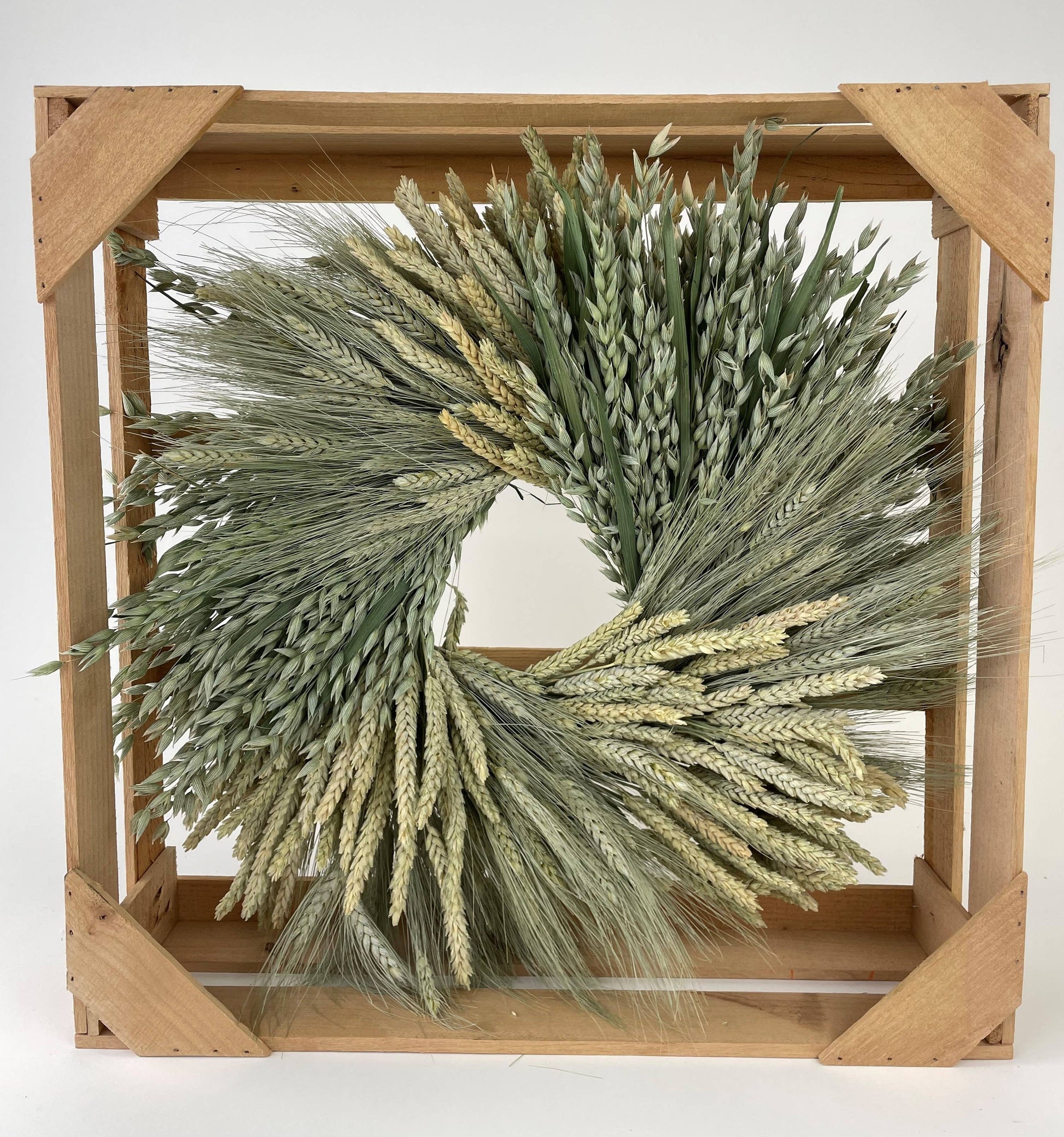 This wreath is handmade in our studio using Arizona grown grains of aveena triticum and green wheat. We made this design clustering the grains alternatively around the wreath to create distinctions between each grain variety.