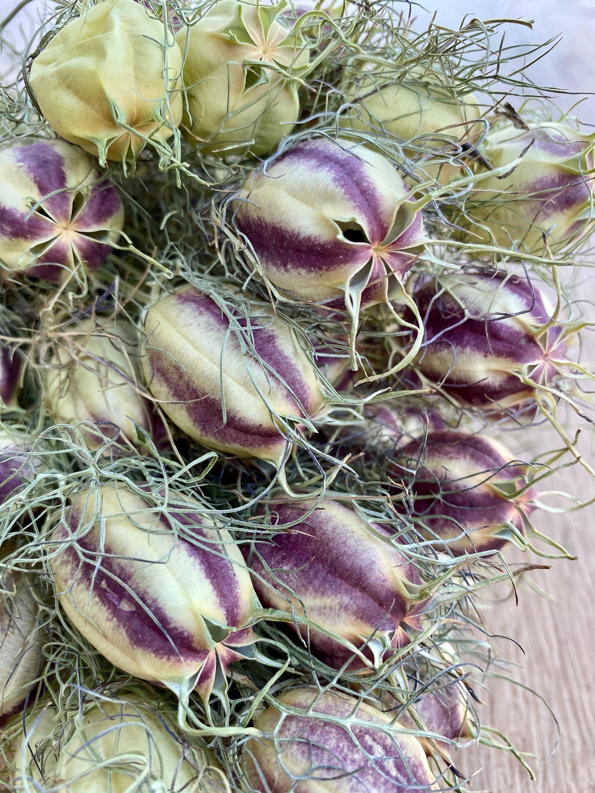 Nigella, also called “Love in a Mist,” is a natural green color with deep burgundy stripes running down the sides of the pod and a fine, lacy net surrounding the pods. The Nigella is dried using ambient air with no added preservatives or coloring. This item will retain the same color, appearance, and integrity dried as when fresh for several years particularly when displayed out of direct sunlight. This item is not promoted to be used for human or animal consumption.