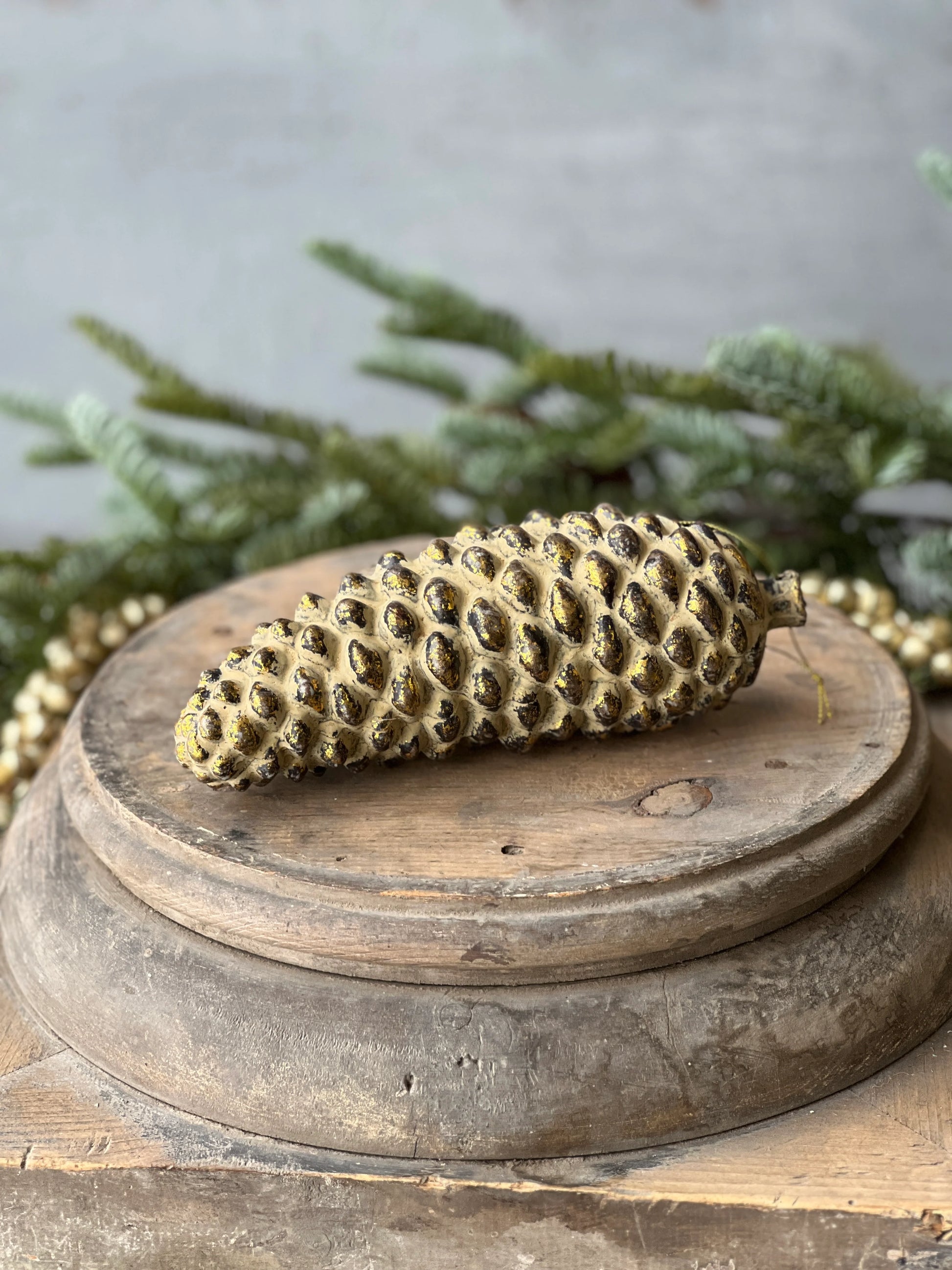 Nature’s artwork is put on full display with these showy pine cones with a distressed/gilded finish.